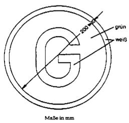 Buchstabe „G“ hinsichtlich Schriftart und -größe gemäß DIN 1451, Teil 2, Ausgabe Februar 1986 (Bezugsquelle siehe § 73). Schriftgröße h = 125 mm. Die Farbtöne sind dem Farbtonregister RAL 840 HR des RAL Deutsches Institut für Gütersicherung und Kennzeichnung e. V., Siegburger Straße 39, 53757 St. Augustin, zu entnehmen, und zwar ist als Farbton zu wählen für weiß: RAL 9001 und für grün: RAL 6001. Die Farben dürfen nicht retroreflektierend sein.