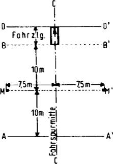 - MotorbremsgeräuschDie Messung wird auf der Messstrecke nach Abbildung 1 beidseitig am beladenen Fahrzeug vorgenommen. Dabei ist diejenige Getriebestufe einzulegen, in der die Geschwindigkeit des Fahrzeugs bei Nennleistungsdrehzahl des Motors am nächsten bei 40 km/h liegt. Aus der der Nennleistungsdrehzahl entsprechenden Geschwindigkeit heraus wird die Motorbremse bei Überqueren der Linie AA´ voll eingeschaltet und der höchste A-Schallpegel an den Messorten während der Vorbeifahrt zwischen den Linien AA´ und BB´ gemessen.Abbildung 1Markierung der Messstrecke für das Messen des Fahrgeräuschs