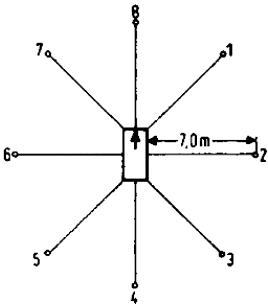 - RundumgeräuschDie Messung erfolgt am stehenden Fahrzeug gemäß Abbildung 2 an acht Messpunkten in 7 m Entfernung vom Fahrzeugumriss und in 1,2 m Höhe.Vor der Messung ist der Motor auf normale Betriebstemperatur zu bringen.Die Messung soll bei folgender Betriebsbedingung ausgeführt werden:Der Gasfußhebel ist stoßweise so weit zu betätigen, dass die Abregeldrehzahl jeweils kurz erreicht wird (Beschleunigungsstoß).Für jeden der acht Messpunkte wird der höchste hierbei auftretende A-Schallpegel ermittelt.Lässt sich aus motortechnischen Gründen keine bestimmte Abregeldrehzahl erreichen, ist die Messung wie folgt durchzuführen.Die Drehzahl wird zunächst auf 3/4 der Nennleistungsdrehzahl konstant gehalten und dann so schnell wie möglich auf Leerlaufdrehzahl abgesenkt.Für jeden der acht Messpunkte wird der höchste A-Schallpegel ermittelt, der während einer kurzen Einhaltung der oben angegebenen konstanten Drehzahl und der Zeit für den Drehzahlabfall auftritt. Bei Anwendung dieses Messverfahrens sind die Grenzwerte für das Rundumgeräusch gegenüber den Werten aus der Tabelle 1 um 5 dB(A) niedriger anzusetzen.Abbildung 2Lage der Messpunkte für das Messen des Rundumgeräuschs