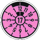- Das Plakettenfeld muss in zwölf gleiche Teile (Zahlen 1 bis 12 entgegen dem Uhrzeigersinn dargestellt) geteilt sein. Der Abschnitt (60°) ist durch die Zahlen 11, 12 und 1 unterbrochen. Die oberste Zahl bezeichnet den Durchführungsmonat des Jahres, dessen letzten beiden Ziffern sich im Mittelkreis befinden.