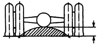 - Die „Bodenfreiheit unter einer Achse“ ist durch die Scheitelhöhe eines Kreisbogens bestimmt, der durch die Mitte der Aufstandsfläche der Reifen einer Achse (der Innenreifen bei Zwillingsreifen) geht und den niedrigsten Festpunkt zwischen den Rädern berührt.Kein starres Teil des Fahrzeugs darf in den gestrichelten Kreisabschnitt der Zeichnung hineinragen. Gegebenenfalls ist die Bodenfreiheit mehrerer Achsen in der Reihenfolge ihrer Anordnung anzugeben, beispielsweise 280/250/250.